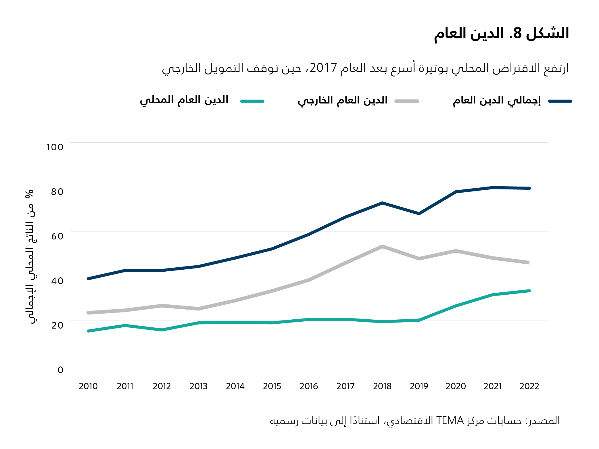 بات تمويل العجز المالي مُرهِقًا جدًّا. لقد كان التمويل في بادئ الأمر يتأتّى من قروض سخية من الجهات المانحة الثنائية والمصارف الإنمائية المتعدّدة الأطراف، إلى جانب قروض من أسواق سندات اليوروبوند بأسعار الفائدة المتدنّية التي كانت سائدة خلال العقد الثاني من القرن الحالي. لكن حجم العجوزات ظل كبيرًا، على الرغم من توصُّل تونس إلى اتفاقَين مع صندوق النقد الدولي خلال العامَين 2013 و2016. وفيما أصبح اجتذاب القروض الخارجية صعبًا، ولا سيما بعد العام 2017، كان لا بدّ من تمويل جزءٍ أكبر من العجز محليًا، ما أسفر عن مزاحمة الاستثمارات الخاصة بشكلٍ إضافي. وفي العام 2022، بلغت نسبة الدين العام 80 في المئة من الناتج المحلي الإجمالي، مقارنةً مع 68 في المئة في العام 2019، مع تقارب حجمَي الدين الداخلي والدين الخارجي (انظر الشكل 8).