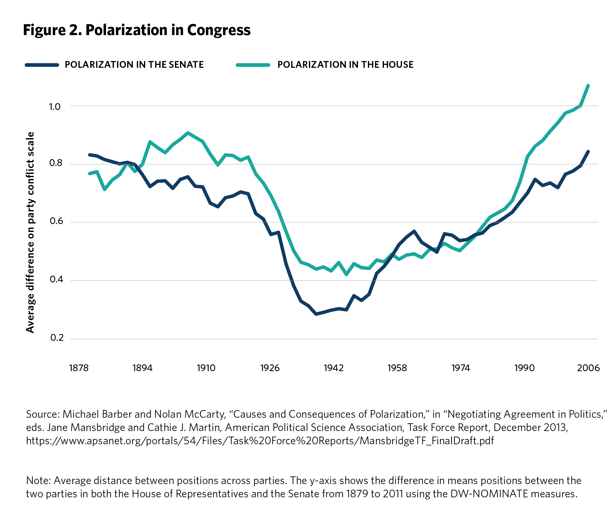 Political scientists began to look into the issue and brought with them the tools of their discipline, which conceived of polarization as ideological distance between policy preferences. To measure that ideological distance in Congress, they used a dataset called DW-Nominate that looked at how members voted.55 Three seminal studies published between 2006 and 2015, including a task force convened by the American Political Science Association, summarized scholarly opinion.56 They found that: